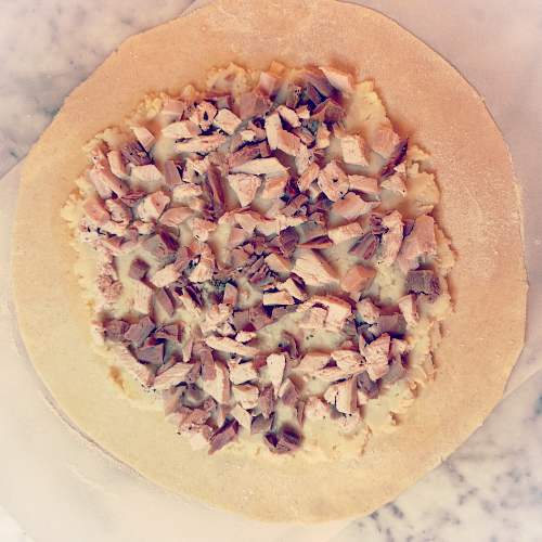 - Potato layer: Spread about 1 to 1 1/2 cups mashed potatoes over the rolled out dough leaving a 2” border.
